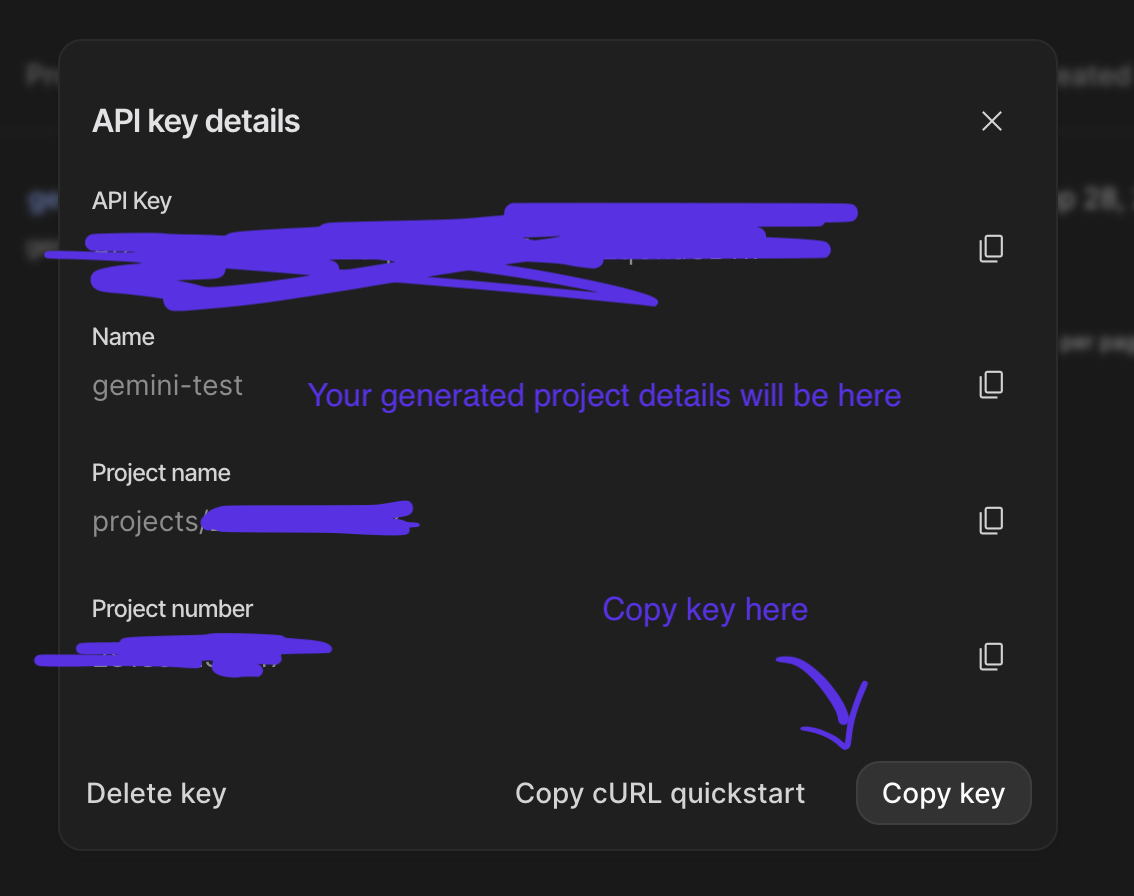 You may be prompted to create or select a project that the API key is associated with — if so, name a project and the key.
