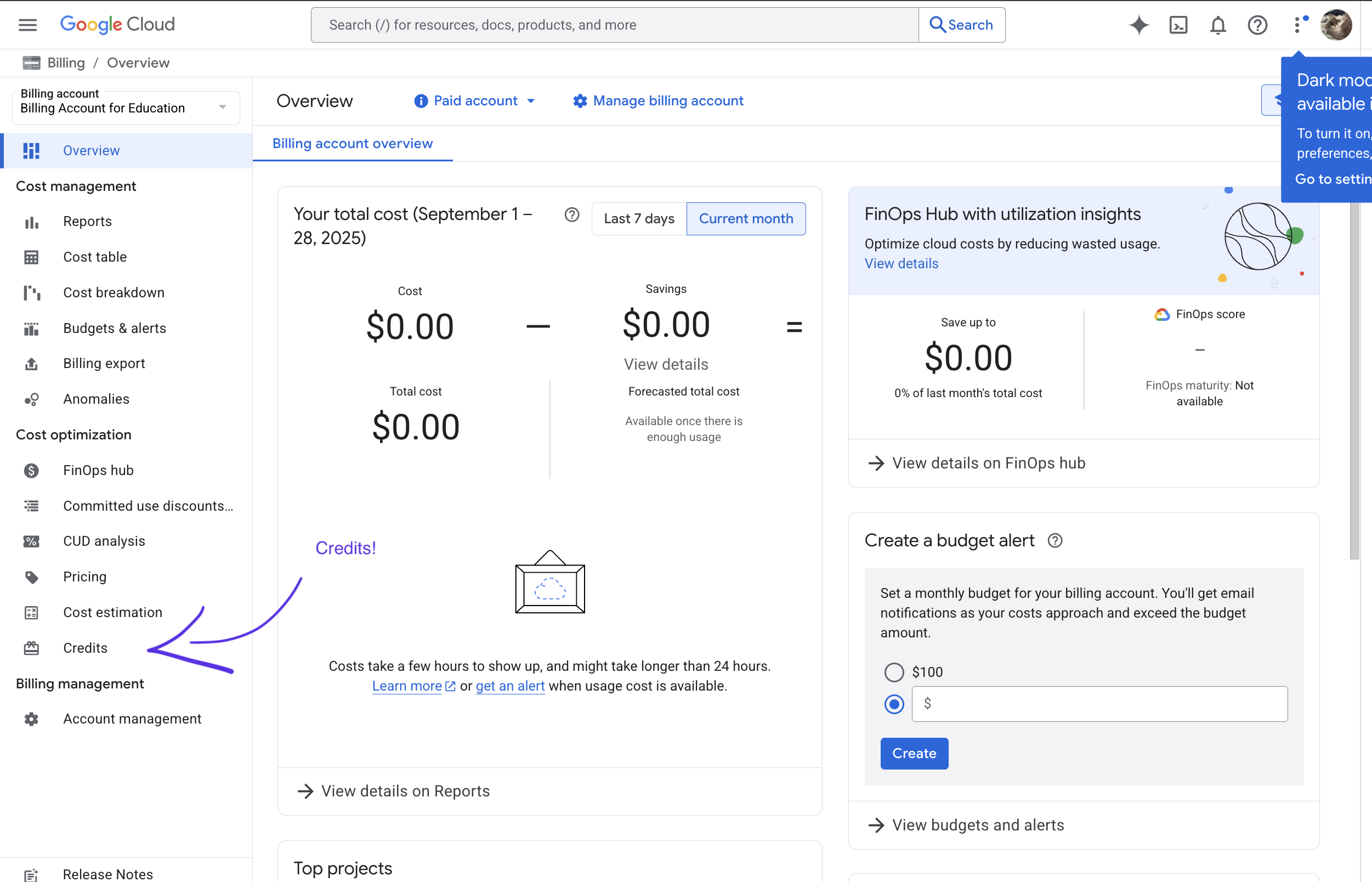 You should now see the Google Cloud dashboard — you can confirm your billing account is set up by clicking Credits in the left-side ribbon.